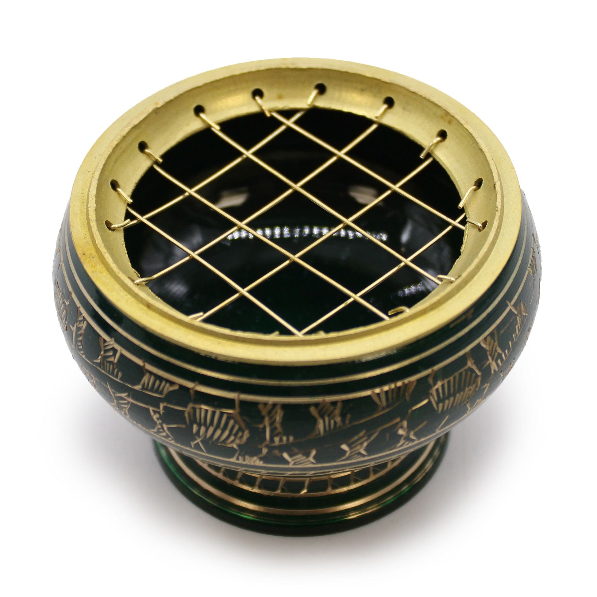Charcoal Incense Jar in beautiful green colour, with a slightly higher base. Decorated with golden patterns, handmade in India. This incense jar can be used during rituals for purification or activation of the Heart chakra.