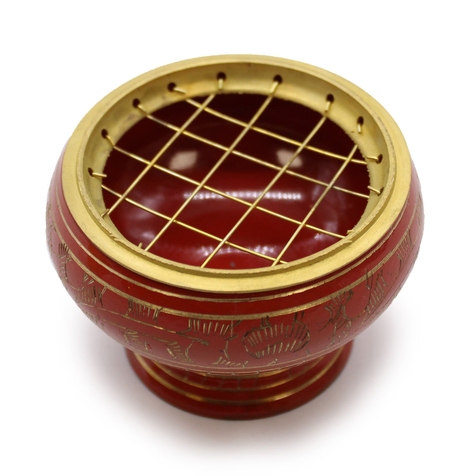 Charcoal Incense Jar in beautiful red colour, with a slightly higher base. Decorated with golden patterns, handmade in India. This incense jar can be used during rituals for purification or activation of the Sacral chakra. Charcoal jars is dedicated to be used with resin and charcoal tablets. Just place them on the removable grate, which will allow the ash to fall into the container.