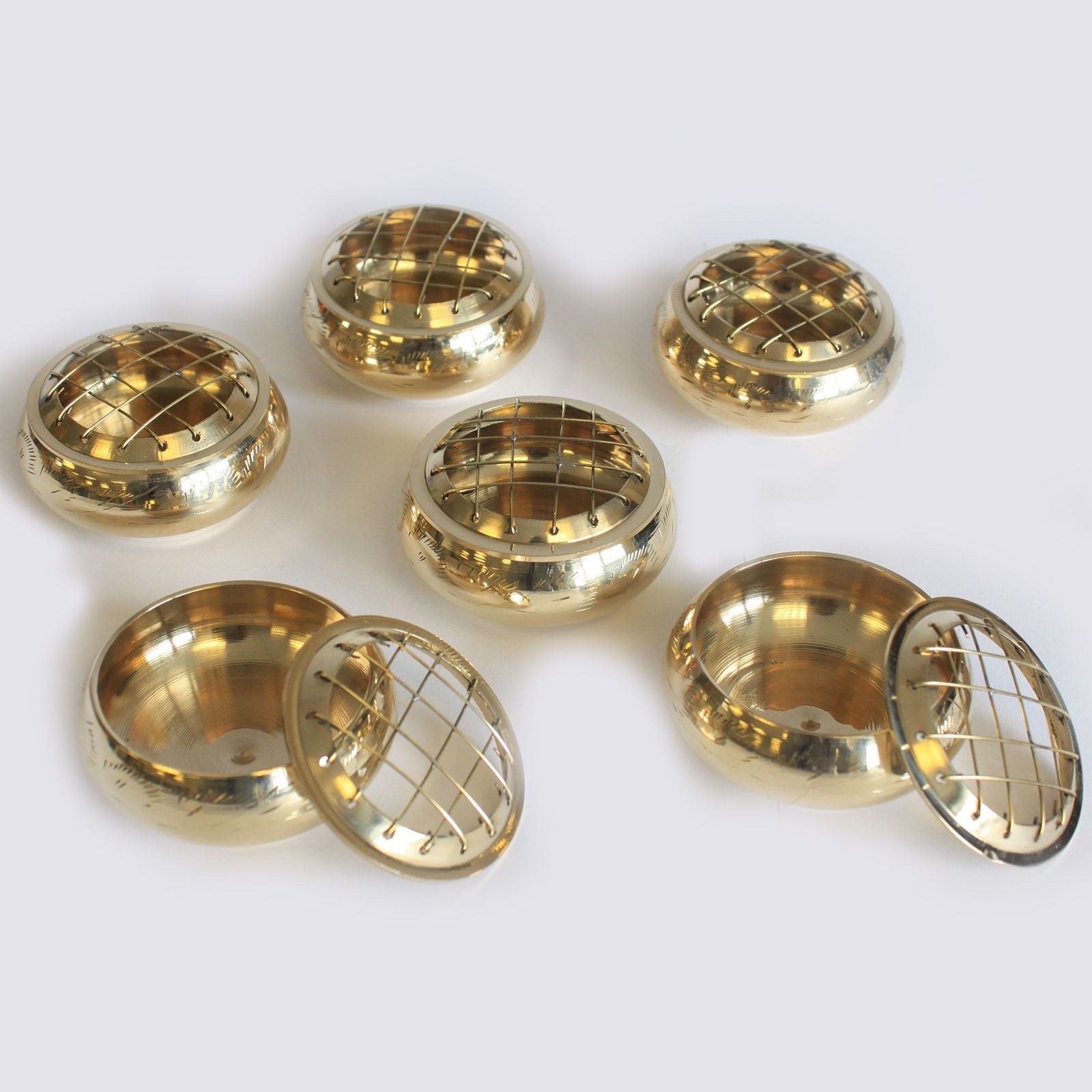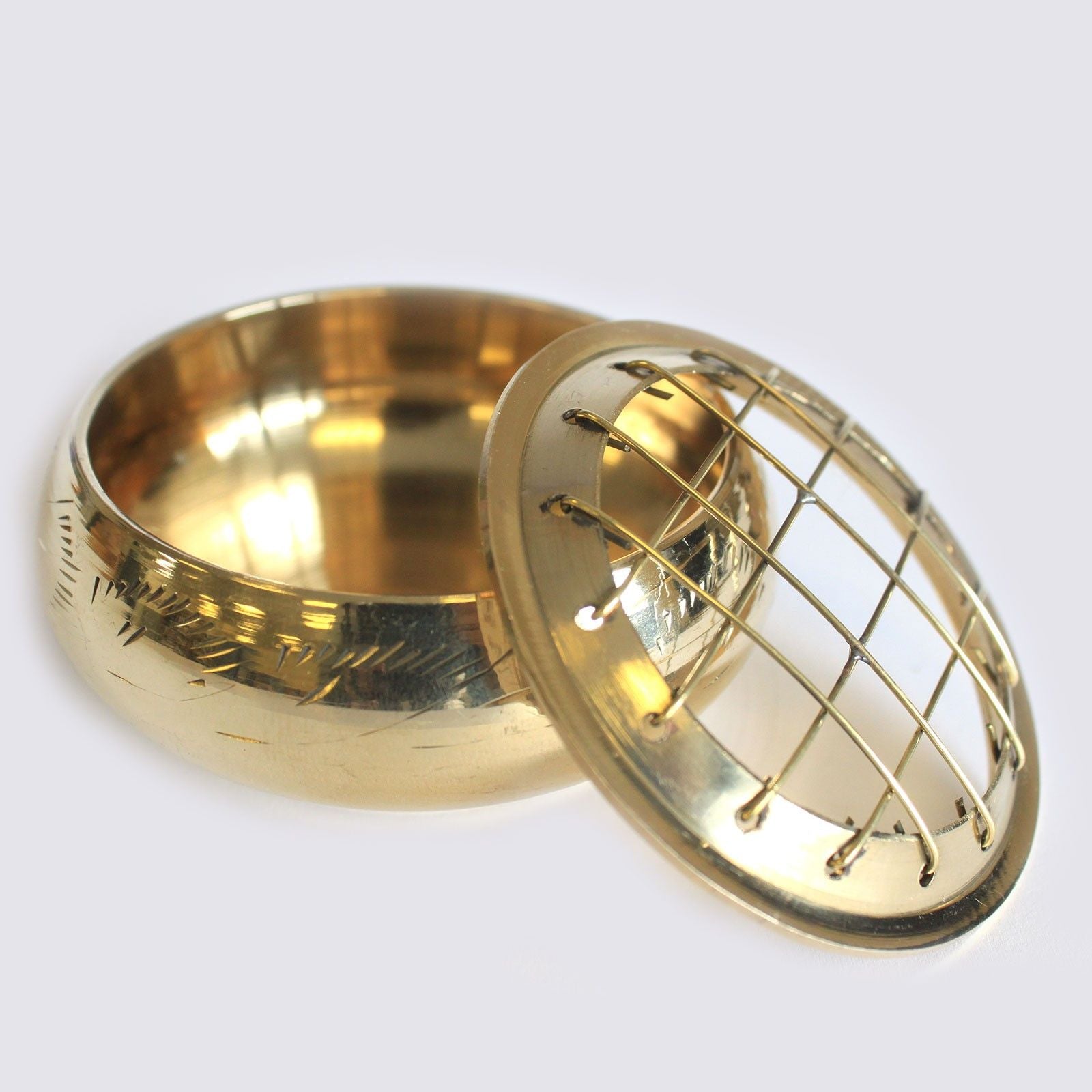 Charcoal Incense jar in yellow polished brass finish, these handy brass screen charcoal burner is great for use with incense resins/cones charcoal disks. made from 100% solid brass with orante design on side of burner.