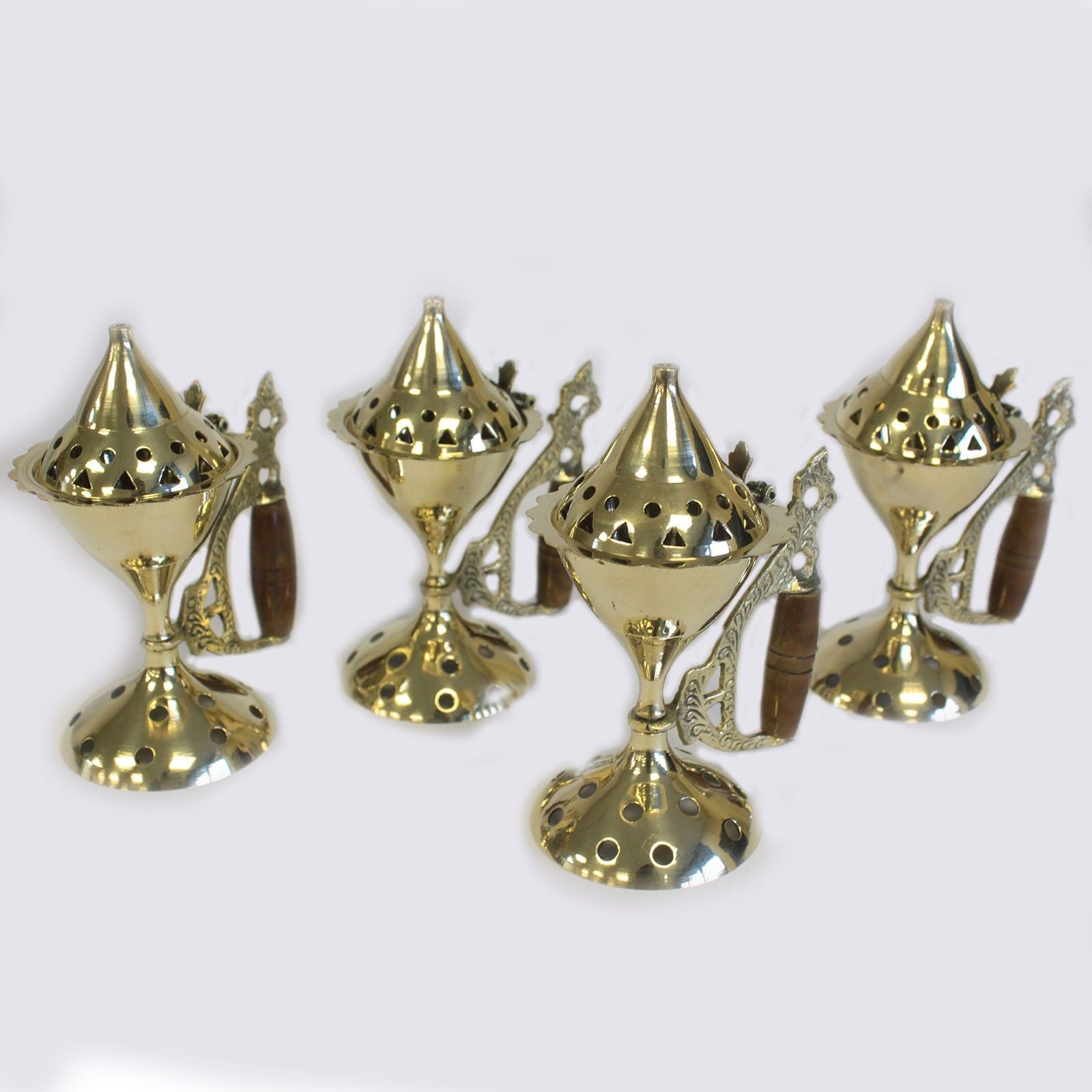 These large Brass cone burner are wonderful for use with charcoal, cone or dhoop incense. It is fashioned of polished brass with a wooden handle in the middle-eastern style. It has holes in the lid to let the smoke rise up even with the lid closed.